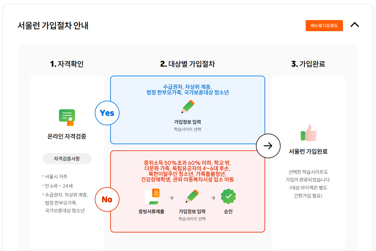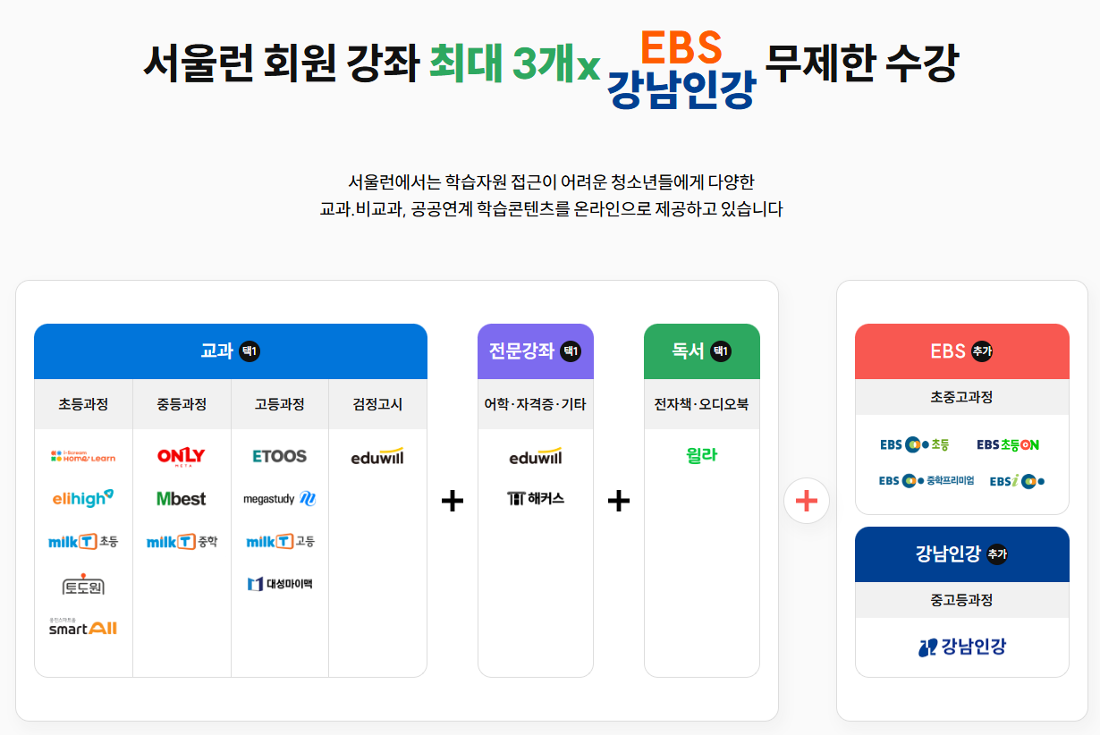 2. 서울런 - 회원가입 시 무료로 온라인 강의 수강 가능, 학습 멘토링 신청 가능 - 서울시 거주 만 6~24세/ 수급권자, 차상위계층, 법정한부모가족, 학교밖청소년 등 가입 가능 - https://slearn.seoul.go.kr/introduction/seoulStory?page=1