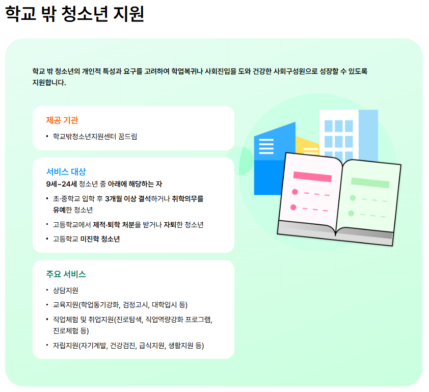 3. 학교밖청소년지원센터 '꿈드림' 이용 - 검정고시 학습을 위한 멘토링, 인터넷 강의 등 지원 - 내주변 센터 찾기: https://www.1388.go.kr/occ/YTOSP_SC_OID_01
